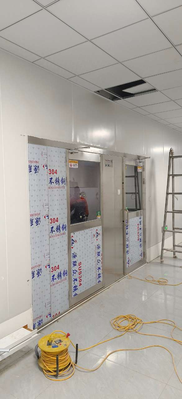 門體安裝:將門體鉸鏈固定于風淋側面廂體。若門框與箱體縫隙不齊平,可能是地面不平導致,需調整風淋下部,墊平底盤,反復調試四角加墊片,直至門體與箱體縫隙整齊。