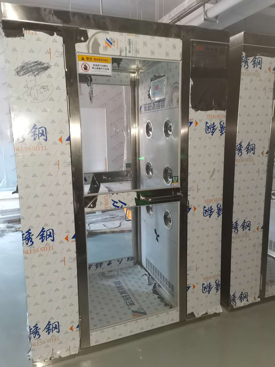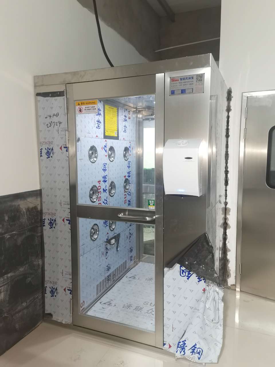 電器安裝:風淋室電器為快速插口件,將力士堅電鎖、紅外線光電、照明燈具等接口插入相應位置即可。
